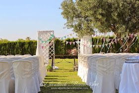 La ceremonia y la celebración tuvo lugar en La Masía de las Estrellas en Catarroja. La ceremonia se celebró junto un olivo centenario del cual colgamos velas, banderines en colores pastel y cintas de raso en rosas, crudos y mint a juego con las damas de honor de María.